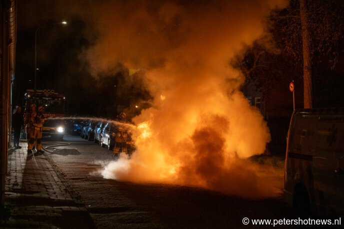 De brandweer had het vuur snel onder controle, maar het nablussen duurder enige tijd. Het gaat om een Toyota Prius (hybride). Een van de ruiten van een woning tegenover de brand is gebarsten door de hitte.