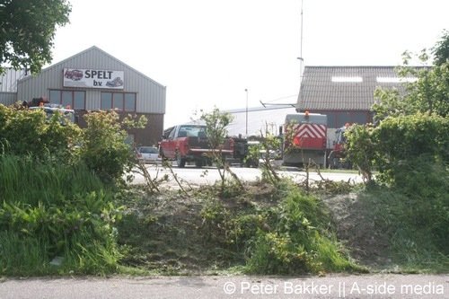 De bestuurder ging even een bakje koffie drinken en had zijn auto op het erf gezet. Hij was vergeten de handrem erop te zetten waardoor het personeel opeens de bakwagen met aanhanger zo vooruit zag rijden, de N231 over steken en vervolgens door een weiland in de sloot terecht kwam.
