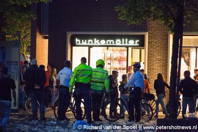 Rond 21.20 uur hielden agenten toezicht op de festiviteiten op het Raadhuisplein en zagen dat de twee mannen klappen hadden uitgedeeld, waarop zij werden aangehouden. De 25-jarige man verzette zich hevig en om hem te kunnen boeien, moest hij naar de grond worden gewerkt. Daarna staakte hij zijn verzet. Bij deze actie liep de 25-jarige man licht letsel op aan zijn gezicht. Het tweetal werd naar het bureau overgebracht en na hun voorgeleiding ingesloten voor onderzoek en verhoor.