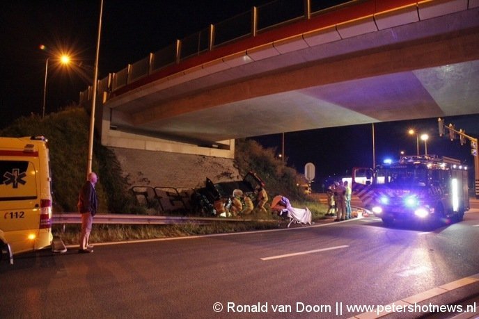 Op zaterdagavond is een oudere man achter het stuur in slaap gevallen, daarbij is het tegen een muur van de N201 brug N231/Legmeerdijk aan gereden in Aalsmeer. Brandweer heeft samen de man uit zijn benarde positie verwijderd. De man kon vervolgens zelf op eigen kracht uit zijn auto stappen. De man raakte gewond.