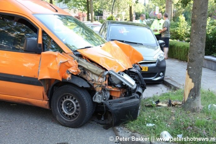 Een bestelbus reed over de Aquamarijn toen hij na een bocht tegen een geparkeerde auto aan reed en vervolgens tegen een boom tot stilstand kwam. Op de doorgaande weg door de wijk Hofland-Noord mag je maximaal 30 km/u.