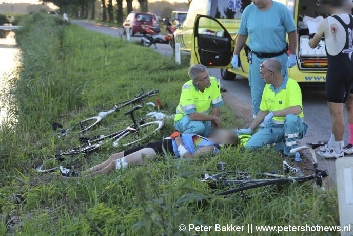 Het incident gebeurde op de rijbaan van de Bovendijk in een flauwe bocht. De auto kwam volgens de wielrenners teveel naar de binnenzijde en raakte de fietsers. Twee van hen moesten naar het ziekenhuis en de anderen liepen flinke schaafwonden op. Hun fietsen zijn kapot.