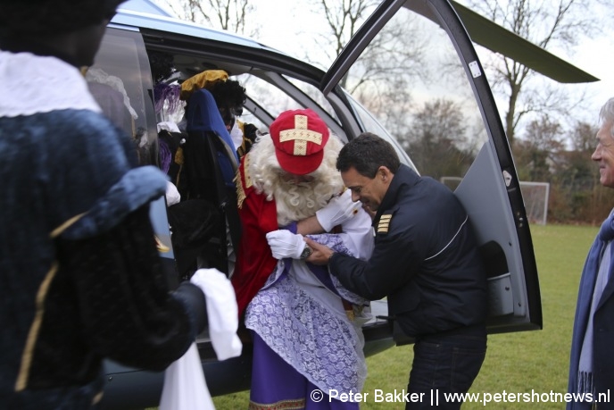 Plotseling klonk er geronk van een helikopter. Na een rondje boven het veld te hebben gevlogen landde hij. Daaruit stapte Sinterklaas, samen met nog vijf Pieten.