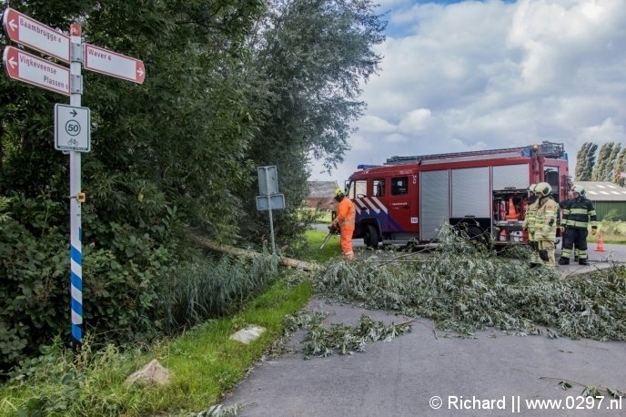 De harde wind had daar een boom omver geblazen. Hij lag hinderlijk op de weg en moest in stukken worden gezaagd. De brandweer had het klusje snel geklaard waarna de Winkeldijk weer vrij was.