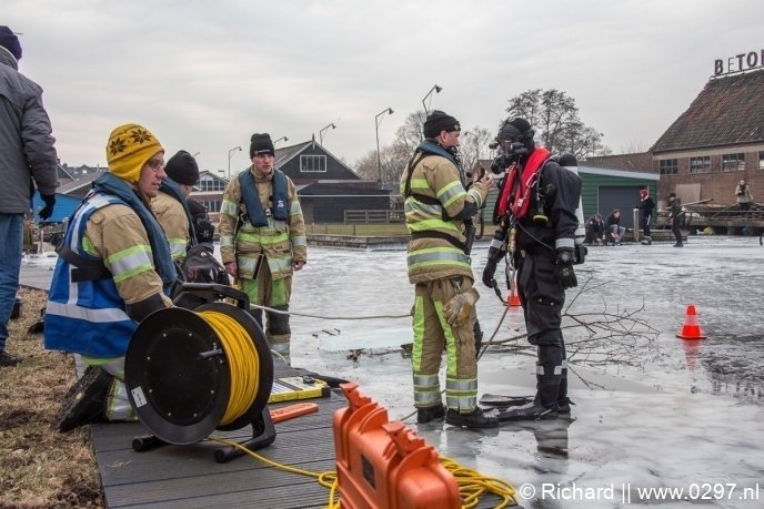 Met een kettingzaken hebben brandweerlieden een wak in de bevroren Vinkeveense Plassen gemaakt. Daarna konden duikers te water om te oefenen. Het water onder de ijslaag was niet bepaald warm. De thermostaat op het brandweerpak gaf twee graden aan.