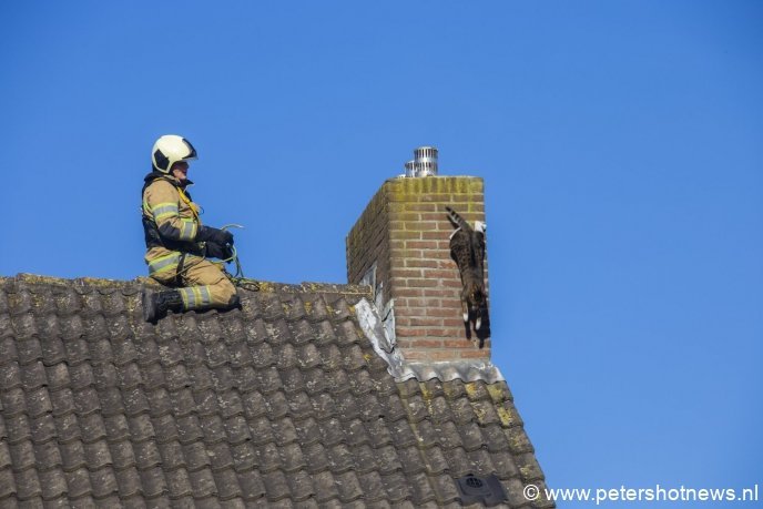 De poes zat op de nok van een woning aan de Ds. W.A Willemplantsoen in Wilnis. Omdat een hoogwerker niet bij de woning kon komen ging de brandweer met een ladder aan de slag. Eenmaal op de nok sloeg het beestje op de vlucht en sprong uiteindelijk zelf van het meters hoge dak.