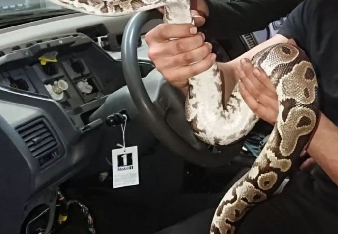 Wat bleek? In het het voertuig zat een slang verscholen. Pogingen om de slang uit de auto te krijgen, waren niet succesvol. De slang, een koningspython van ongeveer 1.20 meter lang, had zich verschanst in het dashboard van de auto.