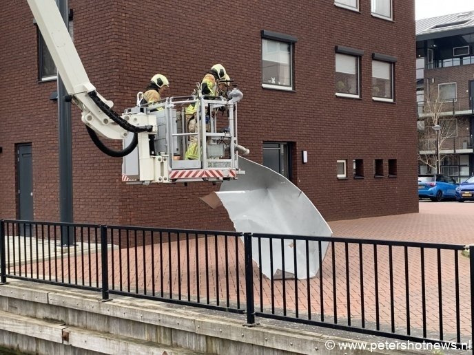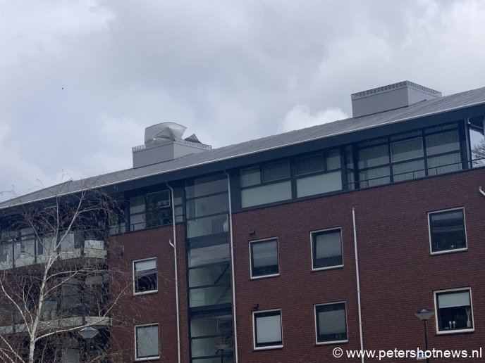 Of de schade is ontstaan door de harde wind van nu of de vorige storm is niet helemaal duidelijk. Op het dak was een metalen plaat los komen te zitten en de situatie werd te gevaarlijk.