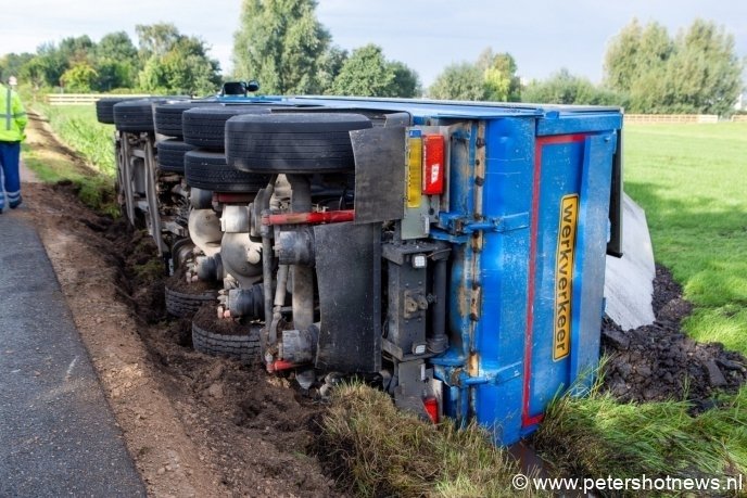 Op de smalle dijk raakte de auto in de berm toen de wagen richting de N201 reed. De vrachtwagen kantelde met een lading asfalt. De bestuurder kon zelf ongedeerd uit de wagen klimmen.