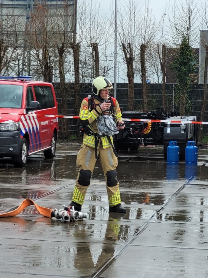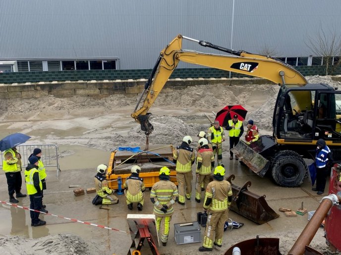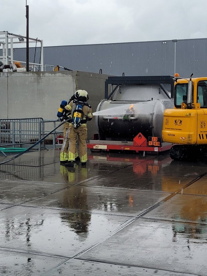 Er bleek een lekkage te zijn ontstaan aan een afsluiter van een LPG tank die gebruikt wordt om graafmachines mee af te tanken waarbij er een ontploffing volgt. Bij aankomst van de ploeg staat er een vlam op de afsluiter en heeft een medewerker brandwonden opgelopen aan zijn handen. Achterop het terrein waren op hetzelfde moment werkzaamheden bezig van een mobiele kraan met betonplaten. Door de ontploffing breekt er een hijsband en valt de last uit de kraan waardoor er een medewerker bekneld raakt. De machinist blijft in shock in zijn kraan achter.
