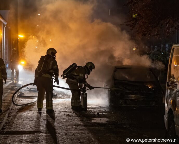 De brandweer had het vuur snel onder controle, maar het nablussen duurder enige tijd. Het gaat om een Toyota Prius (hybride). Een van de ruiten van een woning tegenover de brand is gebarsten door de hitte.